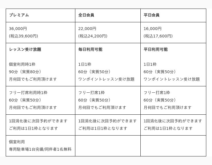 がっつり系はプレミアムでレッスンも練習も利用し放題、しかもプレミアムな個室で90分利用可能。プレミアム会員様、専用駐車場1台完備。