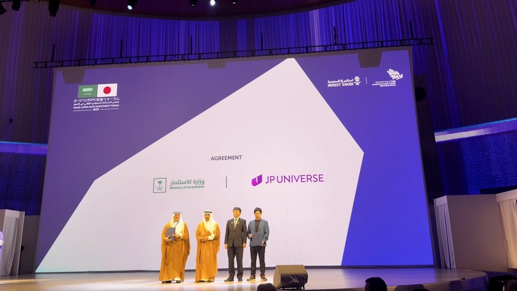 JP UNIVERSE株式会社(本社:東京都、代表取締役:田畑端、以下「JP UNIVERSE」)は、2025年9月24日、サウジアラビア投資省(Ministry of Investment Saudi Arabia, Minister: H.E. Khalid Al-Falih、以下「MISA」)とサウジアラビア発オリジナルゲームへの長期的な戦略的投資および協力に関する覚書(MOU)を締結しました。併せて、オリジナルゲーム開発の中核拠点としてリヤドに「SA GAMES Inc.」を設立し、開発体制を強化します。本調印式は、2025年日本国際博覧会(大阪・関西万博)内の「日・サウジEXPO投資フォーラム」(※1)にて行われました。JP UNIVERSEとMISAはサウジアラビアをMENA(中東・北アフリカ)地域および世界のゲーム開発拠点として位置づけ、AAAゲーム開発・人材育成・産業発展を共同で推進します。