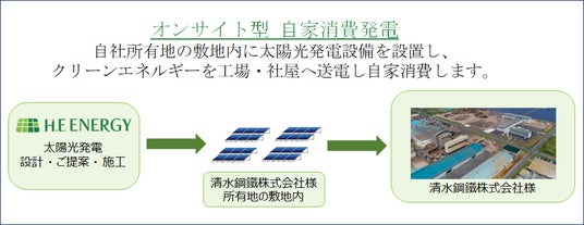 当社で導入した本設備は、清水鋼鐵の工場敷地内に太陽光発電所を設置し、発電した電力を自家消費で利用いただくことで、工場や事務所で使用する電力の一部を賄うことが出来ます。(オンサイト型 自家消費モデル)