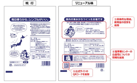パッケージの裏面には、3. 使う際の利便性を高めるため、「食塩」の具体的な使い道や、使用量の目安を記載するとともに、4. 塩事業センターの事業の公益性についての情報を追加しました。また、5. スマートフォンの普及に鑑み、「食塩」や塩事業センターについてより詳しく知りたい方のために、従来のURLに替えて塩事業センター公式サイトのQRコードを追加しました。