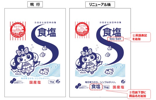 現行とリニューアル後の「食塩1kg」のパッケージ(表面)(リニューアルの内容は「食塩500g」、「食塩5kg」も同じです。)