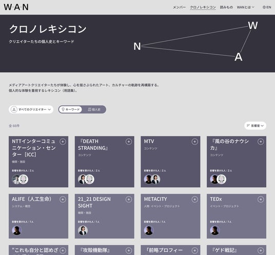 「クロノレキシコン」は、「クロノロジー(年表)」と「レキシコン(用語集)」の機能をあわせ持つ造語です。WANの採択クリエイターが影響を受けたものをキーワード化し、時系列で可視化しています。同時に、その年ごとの社会的な出来事を並列して年表にまとめることで、新たなメディアアート史を描くことを試みる実験的なコンテンツです。