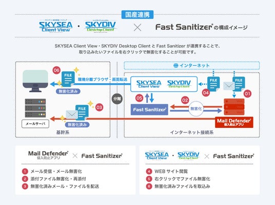 今回の連携により、「SKYSEA Client View」の「ブラウザ環境分離」オプションや「SKYDIV Desktop Client」のシンクライアント環境でダウンロードされたファイルを、「Fast Sanitizer」によって無害化することが可能となりました。これにより、マクロなどの潜在的な脅威を除去した安全なファイルのみを業務環境へ受け渡すことができます。