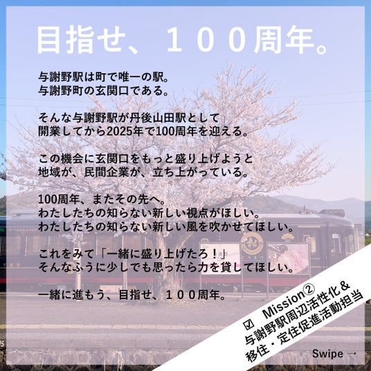Mission2【目指せ、100周年。】与謝野駅周辺活性化&移住・定住推進活動担当