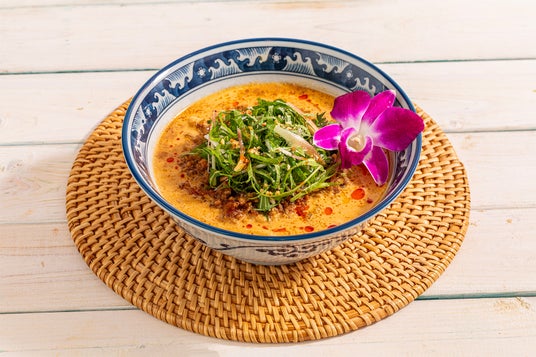 マカダミアナッツとココナッツミルク、鶏だしをベースに、唐辛子と干し海老を隠し味にしたオリジナルスープはクリーミーで“旨辛”な味わいが楽しめます。濃厚なスープとモチモチの米粉麺が絡み合うなかで、鶏肉と豚肉の合い挽きミンチや、砕いたナッツ、シャキシャキの香味野菜3種(大葉・みょうが・水菜)がアクセントになり、暑い季節にもどんどん食べたくなる一品です。