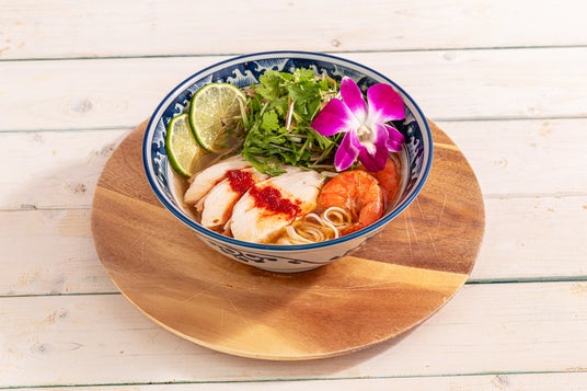 オリジナルの鶏だしスープに、グリルした海老の旨味やバイマックルー(こぶみかんの葉)とレモングラス、2種のアジアンハーブの香りが組み合わさることで香り高く、夏にぴったりの爽やかな一品です。モチモチの米粉麺を絡めて、さっぱりお召し上がりいただけます。
