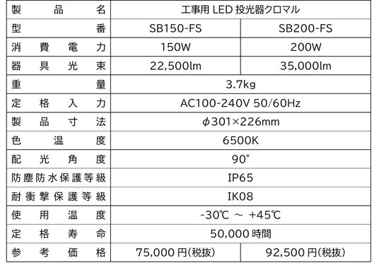 工事用LED投光器『クロマル』は、防塵・防水規格「IP65」に加え、耐衝撃規格「IK08」を取得した現場使用に耐えるプロ仕様のLED投光器です。