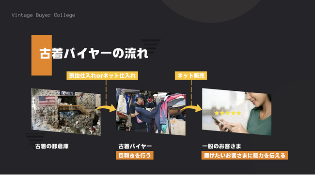 『世界にひとつしかない古着を世の中へ』をビジョンに現役古着バイヤーの佐伯由行が設立した古着バイヤー育成オンラインスクール。