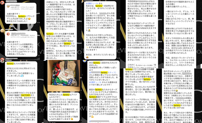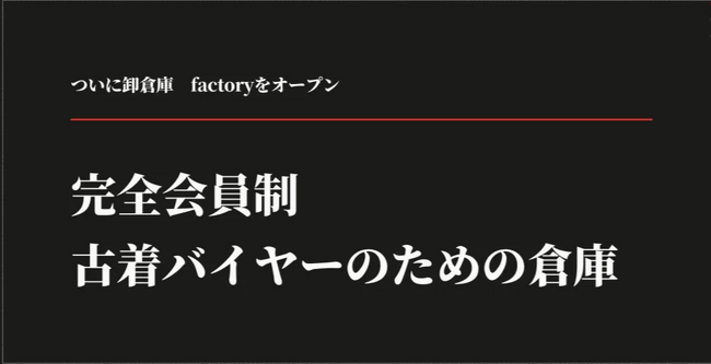 そこで、VBC会長のしーなの発案で、海外で活躍する現地のバイヤーがハンドピックで厳選した古着を直接買い付け、自社の卸倉庫を作ろうという話になったそうです。しーな会長からは、「自社の利益は最低限にすることで会員の方にしっかり1円でも多く稼いでもらいたい」という想いがあるようです。これは会員にとっては嬉しい限りですね。この卸倉庫は「factory(ファクトリー)」と名づけられました。