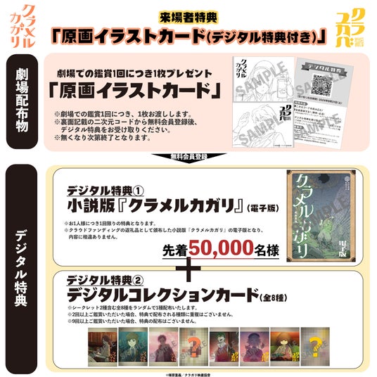長編アニメ映画『クラメルカガリ』『クラユカバ』来場者特典として原画イラストカードと合わせて、デジタル特典の小説版『クラメルカガリ』(電子版)とデジタルコレクションカード(全8種の中から1枚)を配布。