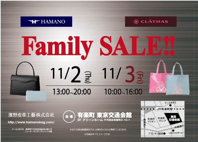 濱野皮革工藝株式会社が展開するハンドバッグブランド「HAMANO」婦人雑貨ブランド「CLATHAS」は、2023年11月2日(木)・11月3日(金)東京交通会館3Fグリーンルームにてファミリーセール「HAMANO CLATHAS FAMILY SALE」を開催いたします。