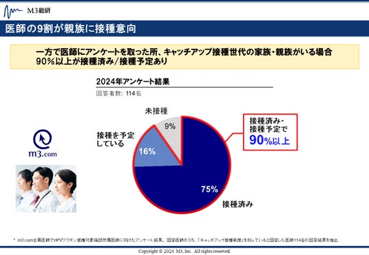 M3総研が子宮頸がんワクチン接種対象施設所属医師*⁵に独自にアンケートを取ったところ、キャッチアップ接種世代の家族・親族がいる場合、90%以上が接種済みまたは接種予定ありと回答しました。