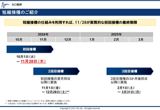 しかし、標準より短い接種間隔で接種する「短縮接種」であれば11月28日まで初回接種を開始することで2025年3月までに3回接種を終えることが可能となります。