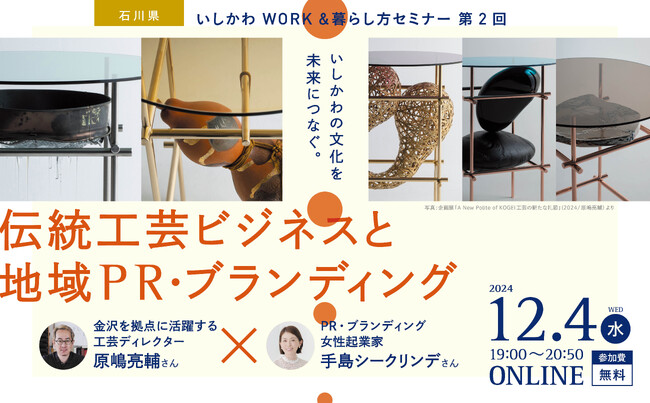 いしかわ「第二のふるさと」推進実行委員会(石川県地域振興課内)は、12月4日(水)に、いしかわ WORK&暮らし方セミナー第2回「いしかわの文化を未来につなぐ。伝統工芸ビジネスと地域PR・ブランディング」を開催します。トークセッションでは、金沢を拠点に活躍する現役の工芸ディレクター原嶋亮輔さん、PRとブランディングを専門とする手島シークリンデさんを迎え、「伝統工芸の魅力を世界へ」と「地域PR・ブランディングの仕事」についてお話しいただきます。