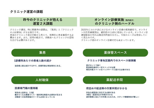 クリニック側・患者側双方のオンライン診療へのニーズを満たす新たなモデルを作ります。オンライン診療実施のハードルである「薬保管スペース」と「配送のシステム化」を施設が提供・サポートし、クリニック・患者双方にとりスマートなオンライン診療を実現します。