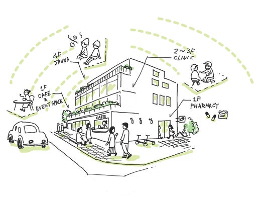 街の暮らしの一部になるようなコンテンツ(カフェ、イベントスペース等を予定)を設置し、地域の人と日常的な接点を創出します。気軽に街の人が立ち寄ることができる要素を盛り込み、病気でなくても訪れたい・行ってみたいと思える場所を施設に設けます。その街に合った「にぎわいのコンテンツ」を加味し、集客力・発信力を備えた複合施設を作り、人の集まる賑わいを生み出し、日常の施設利用を通じたクリニックの認知度を上げる仕組みを作ります。