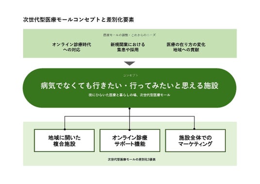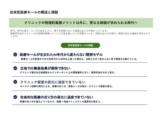 当社は、クリニックや医療を取り巻く環境の変化に、不動産業の側からアプローチ・サポート・地域貢献することができるのではないかと考えてきました。この30年の間に開発された医療モール(※1)は、ほぼ同様の仕様・形態で開発されたものがほとんどです。今回当社が「次世代型医療モール YADORIGI PROJECT」として新たに試みる開発プロジェクトは「集患・オンライン診療・マーケティング・地域」をテーマとしています。「医療施設から街の居場所に」なることを目指し、単なる医療機関の集合体から、地域住民の日常と医療を結びつける次世代型医療モールを提案します。街の新たな拠り所になる場として、地域に暮らす様々な人々の医療に対するハードルを下げることで地域全体の健康を下支えする、そんな日常の場づくりを目指します。