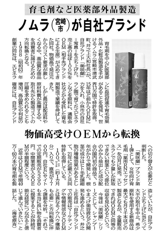2023年10月2日、日本初※2の育毛剤「美咲蘭 薬用RNエッセンス」を発売。OEMから自社ブランドへ方向転換を行った取組みを宮崎日日新聞社様に取材していただき、11月3日の経済面に記事が掲載されました。