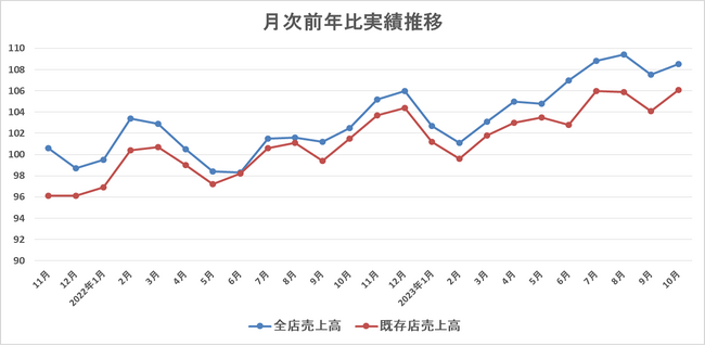 2023年6月から全店売上高に株式会社ハツトリーの実績を合算し、全店売上高は8.5%増だった。