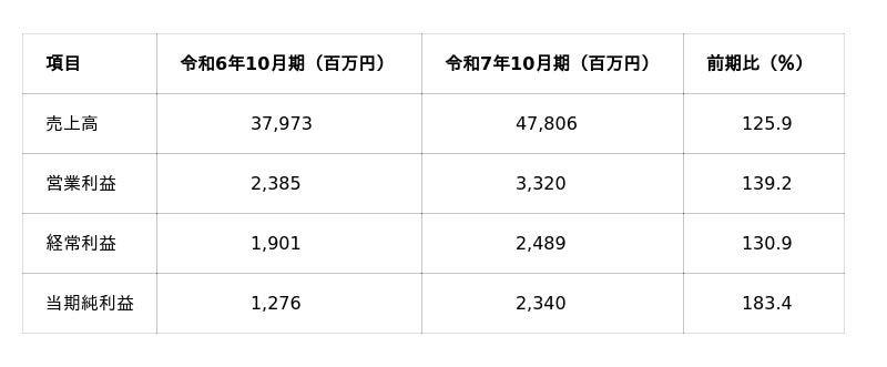 令和7年10月期において、当社グループは売上高47,806百万円(前期比125.9%)、営業利益3,320百万円(前期比139.2%)、経常利益2,489百万円(前期比130.9%)、当期純利益2,340百万円(前期比183.4%)と大幅な増収増益を達成いたしました。