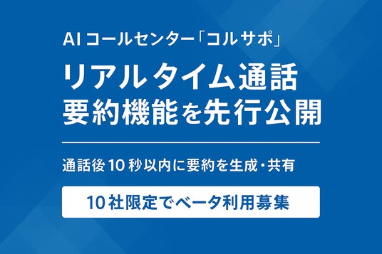 株式会社エクサテック(本社:岩手県盛岡市、代表取締役:大西 洋平太、以下「当社」)は、AI コールセンター支援サービス 「コルサポ」 において、新機能 「リアルタイム通話要約」 を 2025 年 7 月 7 日より先行公開し、先着 10 社 を対象に無償ベータプログラムを開始いたします。