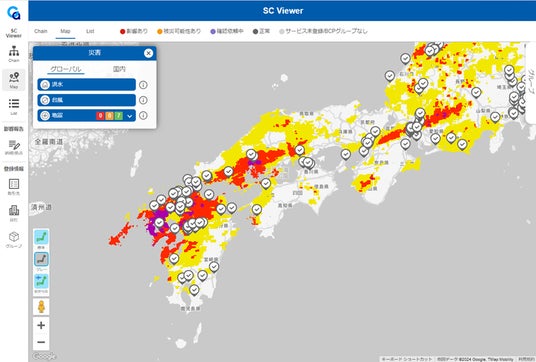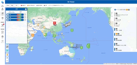 自社・サプライチェーンのリスク管理に活用可能なクラウドサービスです。登録した生産/物流拠点、販売拠点付近での災害発生時にアラートを受け取れ、影響を可視化できます。さらに平時・有事に自社や取引先の担当者との双方向でコミュニケーションするためのチャット、アンケートタスク、ファイル管理なども利用できます。