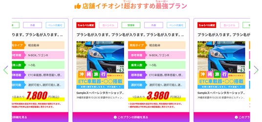 「ちゅらベル」に加盟している掲載中の店舗の販売プランをリアルタイムに集計し、料金相場(各エリアごとの平均価格・最安値・最高値)を自動表示する機能を搭載しており、ユーザーによるレンタカー選びの参考ツールとして使用していただけます。