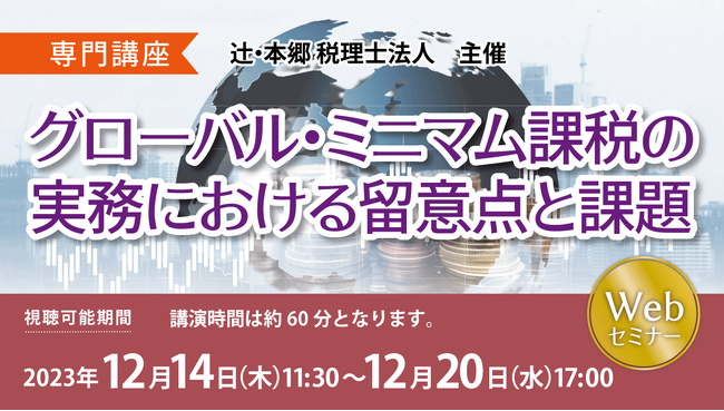 辻・本郷 税理士法人(本社:東京都新宿区、理事長:徳田孝司)は、2023年12月14日(木)より「【専門講座】グローバル・ミニマム課税の実務における留意点と課題」セミナーを開催いたします。令和5年度税制改正において多国籍企業グループを対象とした新たな国際課税ルールとなる「国際最低課税額制度(グローバル・ミニマム課税制度)」が導入されました。本セミナーでは、本制度の概観に触れた上、実務上の問題点や留意点とそれに係る課題を探り、可能な限りその対応策を検討、提言します。