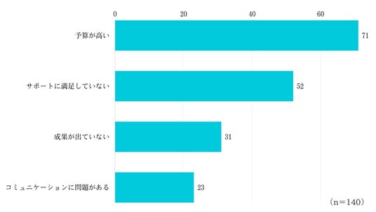 外部に委託している中での不満点として、「予算が高い」が最も高い結果となった。次いで、「サポートに満足していない」「成果が出ていない」が続いた。