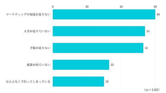 社内で実施していることに対する不満点としては、「マーケティングの知見が足りない」が最も多い結果となった。また、次いで「人手が足りていない」「予算が足りていない」が続き、「知見・人手・予算」の3点が主に課題になっていることがわかる。