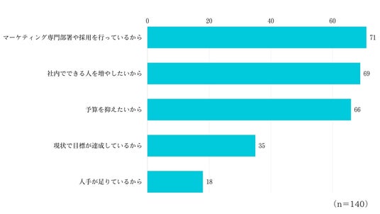 社内でマーケティングを実施している理由に対しては、「マーケティング専門部署や採用を行っているから」が最も高く、マーケティングの体制を整えている企業が多いことがわかる。次いで多かったのは「社内でできる人を増やしたいから」「予算を抑えたいから」だった。
