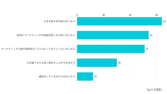 外部に委託している企業に理由を質問したところ「人手不足で手が回らないから」が最も多かった。また、「社内にマーケティングの知見を持った人がいないから」「マーケティング人材の採用を行っていない/うまくいっていないから」が続いているため、人材に問題を抱えている企業の割合が高いと言えるだろう。