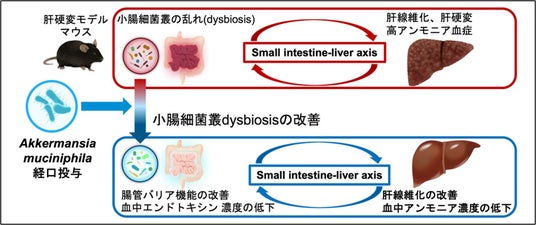 慢性肝障害により肝臓の線維化が生じます。そして肝線維化が進行した状態である肝硬変は社会生活や生命予後にかかわる疾患です。腸内細菌叢は宿主の健康状態に影響を及ぼし、腸内細菌叢の乱れ(dysbiosis)が様々な疾患と関連するとされ、肝硬変と腸内細菌叢との間にも密接な相互作用「gut-liver axis」が存在すると考えられてきました。しかし、その詳細は明らかではありませんでした。また、近年、肝線維化・肝硬変は慢性肝障害の原因を排除することにより改善する可能性があると認識されるようになりましたが、改善を促すような治療法は確立されておらず、重要な臨床的課題となっています。本研究では、肝硬変モデルマウスを用いた検討を行い、腸管の中でも特に小腸の細菌叢が肝線維化の病態に関与することを示しました。これにより「small intestine-liver axis」という新たな概念の提唱に至りました。そして、同モデルマウスにおいて、ヒトにも常在する細菌種であるAkkermansia muciniphila(アッカーマンシア ムシニフィラ)(A. muciniphila)の小腸における増加が、肝線維化の改善と相関することを見出しました。さらに、A. muciniphilaを肝硬変モデルマウスに経口投与することで、肝線維化の改善を促進することを明らかにしました(図1)。本研究の成果は、小腸細菌叢を標的とした肝線維化・肝硬変に対する新規治療法の基礎的知見となることが期待されます。
