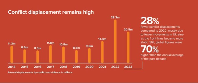 紛争による避難は、ウクライナでの避難が甚大であった2022年と比べると28%減少したが、2021年以前の平均と比べるといまだ70%ほど高水準にある (C) IDMC, GRID 2024