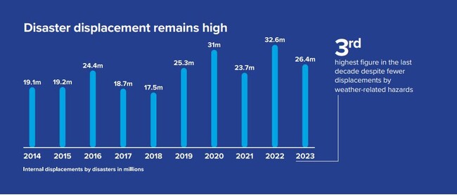 2023年の災害による避難は2,640万人で、同年は気象の影響による危険が少なかったにも関わらず、過去10年間で3番目に多い (C) IDMC, GRID 2024