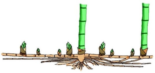 そのひとつひとつが「地下茎」でつながり、芽が出てタケノコになり、竹に成長。