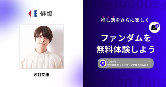 ファンダムアプリ「Replive(リプライブ)」を運営する、Replive株式会社(本社:千葉県浦安市、代表取締役CEO:飯野 太治朗、URL:https://replive.jp/ )は、2025年5月29日(木)より新たに声優・汐谷文康氏(東京俳優生活協同組合所属)の「ファンダム」の公開を開始いたします。すでにファンダムを公開中の俳協の人気声優陣と共に特別な推し活体験をお届けします。
