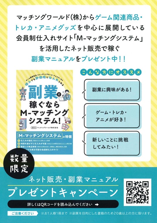 マッチングワールド株式会社(東京都・中央区)は、7月3日に副業・兼業者に向けた書籍を出版いたしました。会員制の卸売・仕入れサイト「M-マッチングシステム」を使った副業マニュアル本です。