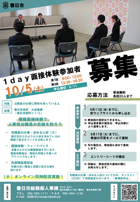 春日市では、実際の面接試験を想定した模擬面接を体験してもらうことで、面接官となる人事担当職員がどこを見ているのかを知ることができる1day面接体験セミナーを実施します。