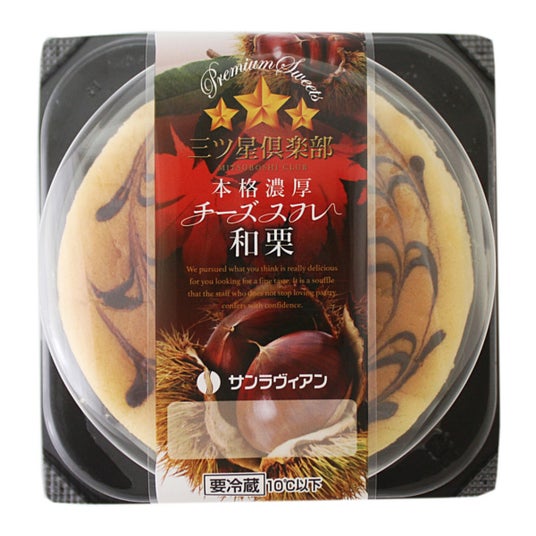 【本格濃厚チーズスフレ 和栗】香り豊かな和栗ペーストをたっぷりと練り込んだ、なめらかな口どけのチーズスフレです。チョコレートで線画きし、見た目も華やかに仕上げました。