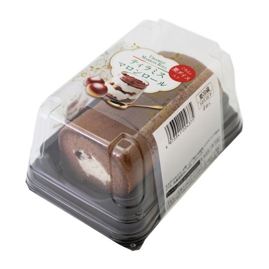 【ティラミスマロンロール】北海道産生乳100%のマスカルポーネを使用したティラミス風ホイップに、渋皮付き和栗ダイスをトッピングし、ココアスポンジで包みました。