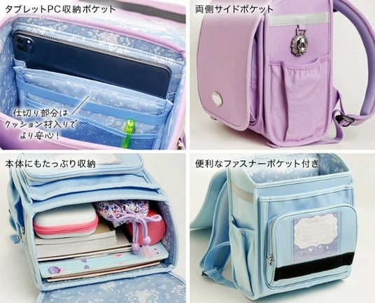 生地を使っているからこそ実現できた実用ポケットの数々充実の収納機能今の小学生のリアルな持ち物に配慮し、パッドやPCが入るポケットを内側に標準装備。クッション性はもちろん、固定のゴムバンドもついて、安全に持ち運べる仕様となっています。充電コードやタッチペンなども入るメッシュポケットも便利。