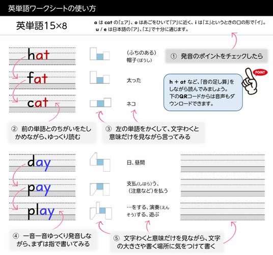 専用の単語練習シートには、綴りを形として