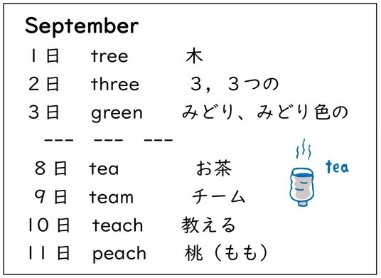 tea や team から、ここでの ea は「イー」のように発音されることに気づけるように、teach が未習でも peach からその読みを推測できるように単語を配列しています。