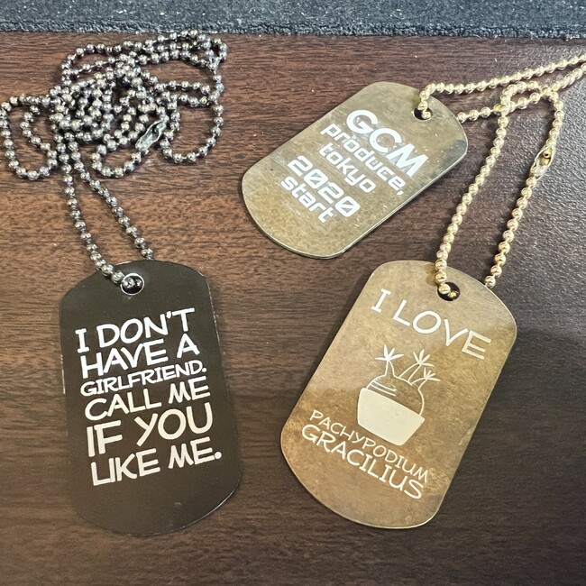 五味彫刻の「DOG TAG」には元来のDOG TAGらしい文字だけのメッセージから好きな絵柄に至るまで、なんでもプリントすることができる。80年代にヒットしたDOG TAGでは「自分だけのメッセージ」「自分だけの刻印」と言えば、文字通り1億通りのバリエーションで名前や座右の銘を打刻する必要があり、だからこそ雑誌に私たちが心を躍らせた広告が掲載されていた。