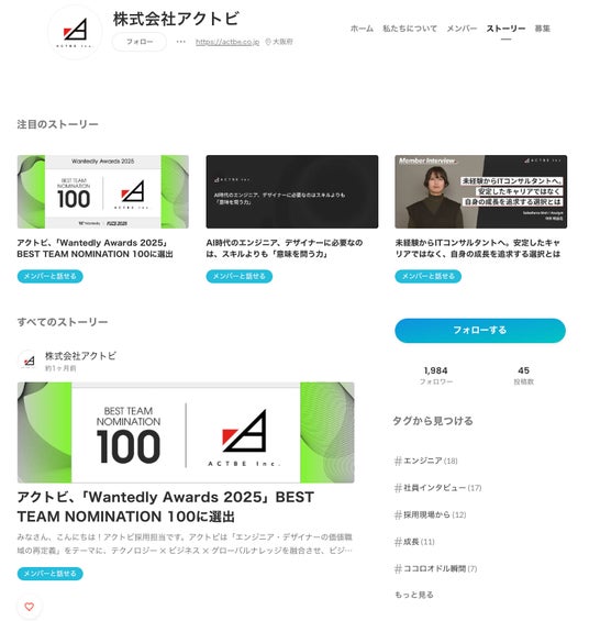 Wantedly認定パートナー公式サイト掲載順位1位の株式会社OTOGI(本社:大阪府大阪市、代表取締役:山本哲也)は、運用を支援する株式会社アクトビが、ウォンテッドリー株式会社主催の『Wantedly Awards 2025』において「BEST TEAM NOMINATION 100」に選出されたことをお知らせいたします。