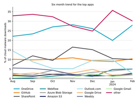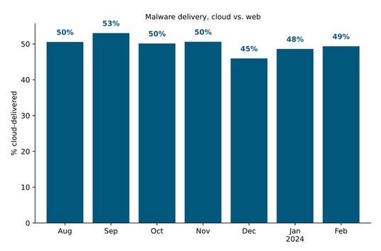 攻撃者は、一般的なクラウドアプリを介して悪意あるコンテンツを配信することで、検知を回避しようと試みています。マルウェアの配信にクラウドアプリを悪用することにより、主にドメインブロックリストやURLフィルタリングに依存するセキュリティ制御や、クラウドトラフィックを検査しないセキュリティ制御の回避が可能になります。2024年2月、HTTP/HTTPSマルウェアのダウンロード全体の49%は、一般的なクラウドアプリケーションから配信されました。過去6カ月にわたり、一般的なクラウドアプリからのマルウェアダウンロードの割合は50%前後で推移しています。