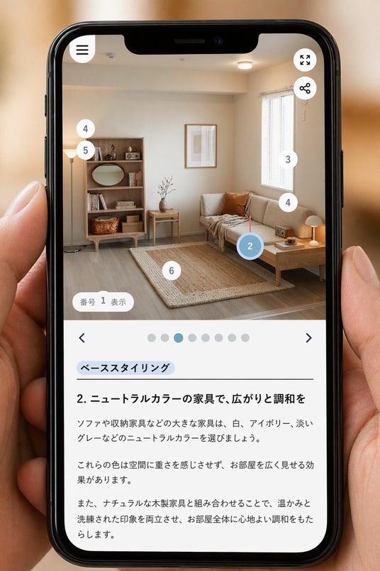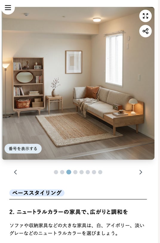 「なぜこの配置なのか」「なぜこの色なのか」まで分かるので、ユーザーは提案を受け取るだけでなく、学びながらお部屋づくりを進めることができます。