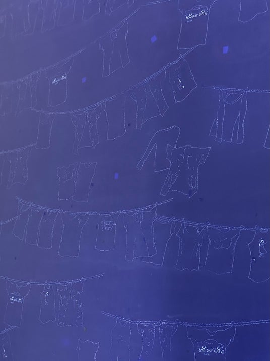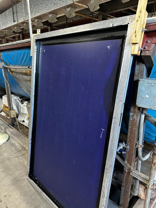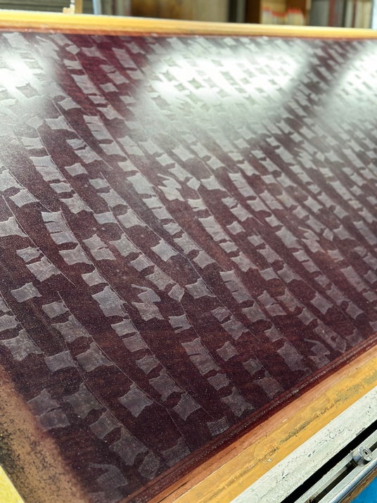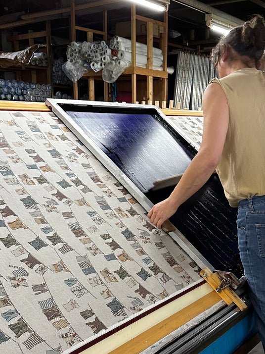 25メートルの捺染台の上にプリントの下生地となる生地を張り1メートル程度の枠を置き、1色ずつ染料を流し込みゴムの付いたスケージでで上から下へと刷ります。1色目を仕上げたら乾燥させ2色目もまた同じように繰り返し色数分の同じ作業を絵柄がズレないように染料を均等に伸ばしながら、慎重に、丁寧に。