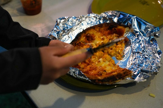チーズにコーン、ピーマン、トマト好みの食材を選んでトッピング。窯に入れたらあとは焚き火をしながら焼き上がりを待ちます。